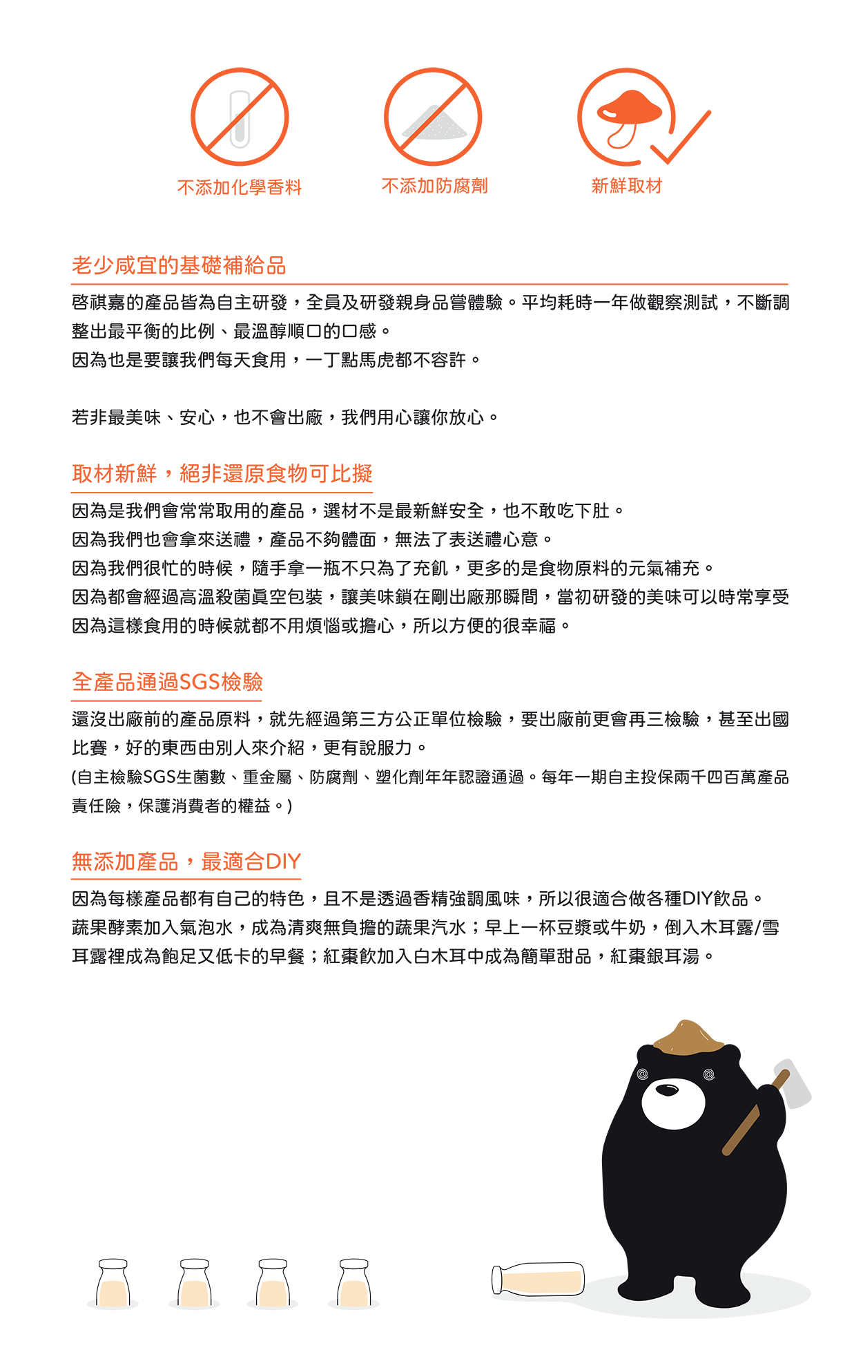 一路以來的產品,不論是階段性或常態產品:從紅毛苔、蔬果酵素、日曬拌麵/手工拌醬、有機黑木耳/雪耳、堅果、到多醣體、葉黃素飲、美顏飲,都是秉持初心「純粹自然、無添加、無負擔」的研發理念堅持實行,目前也在做更多種不同的嘗試,希望能讓更多人受惠,更讓吃到食物的原味的夢想實現。